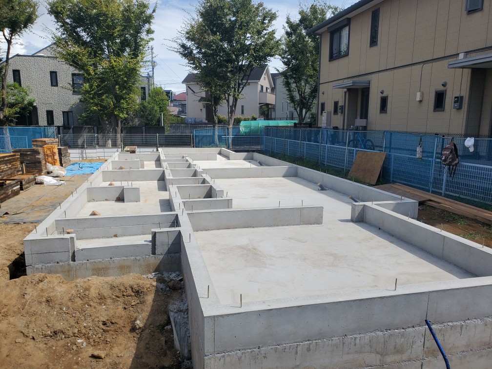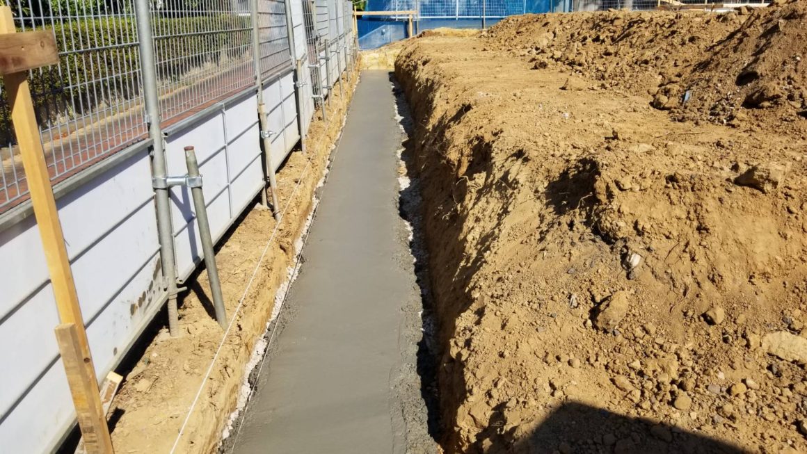 A号棟深か基礎部分捨コンとB号棟捨コン打設、現場が道路より高いので、ポンプ車での打設をしたので早めに打設ができた。