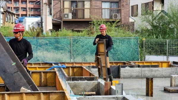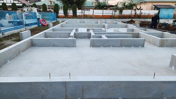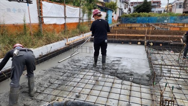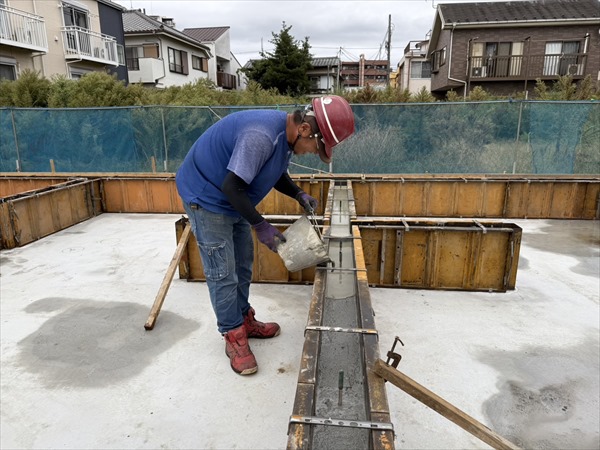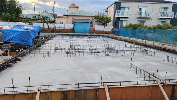今日は朝からコンクリート打設を行いました。立ち上がりコンクリート打設はアンカーが芯にくるように慎重に調整しました。夕方にはレベラーも流せたので順調でした。