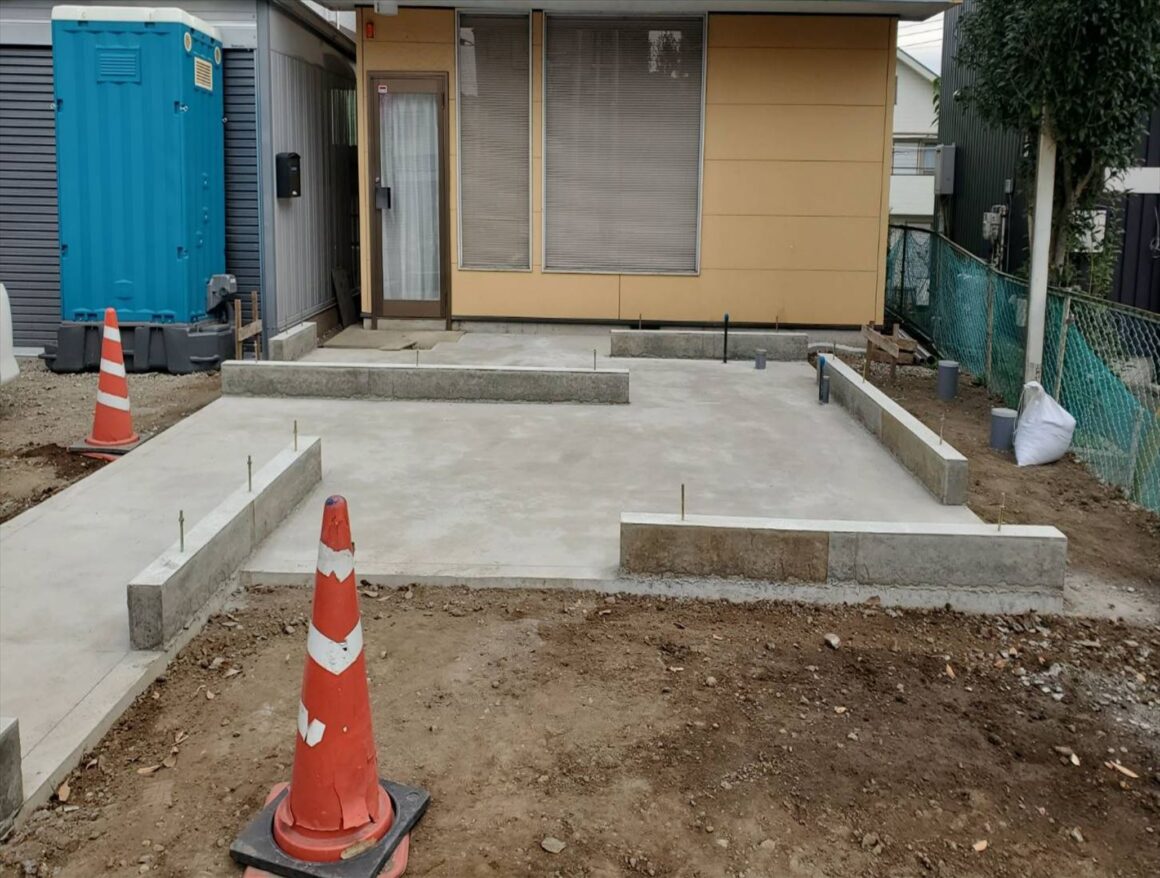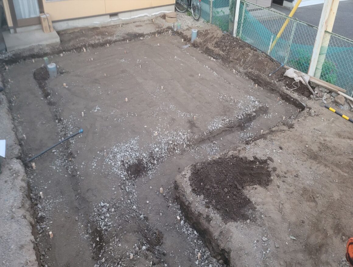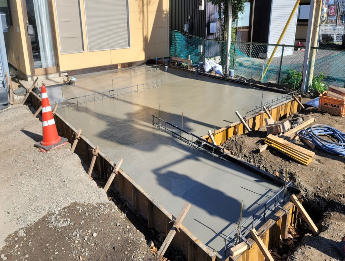 今日は、午後から捨てコンクリート打設を行いました。コンクリートが跳ねないように打設しました。
