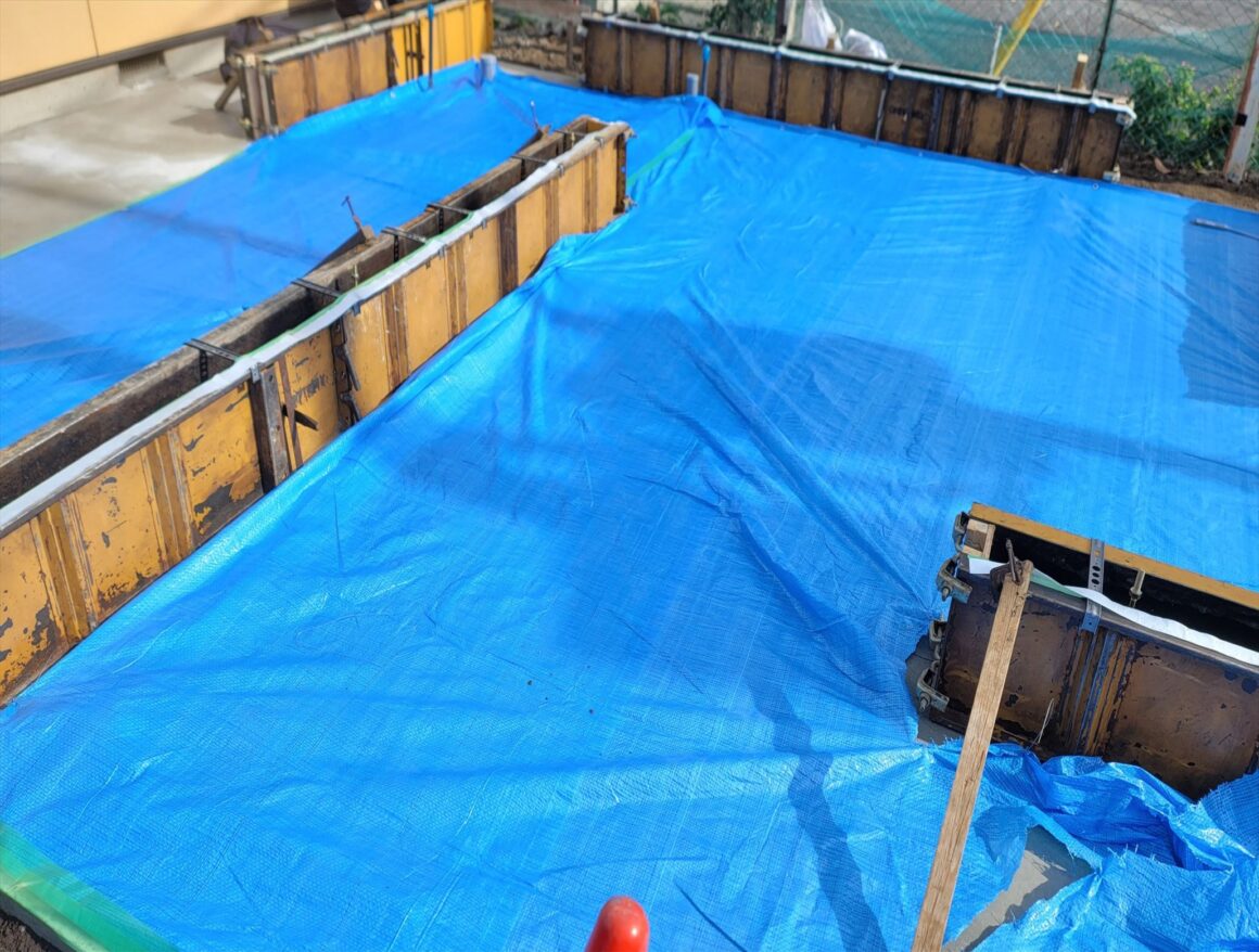 今日は墨出し・枠組・立ち上がりコンクリート打設を行いました。耐圧版が汚れないように養生をして打設をしました。