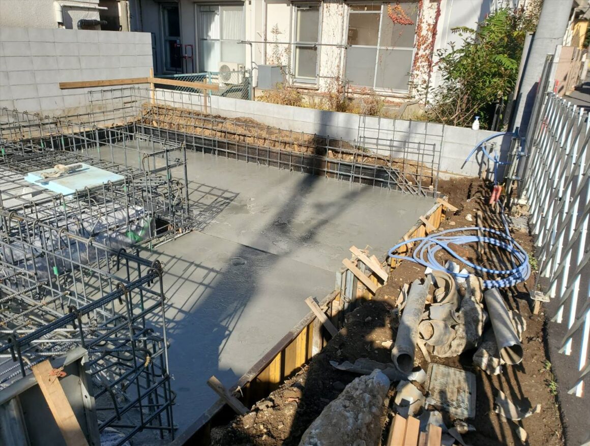 今日は午後から捨てコンクリート打設を行いました。しっかりと墨が出せるようにキレイに均し、周りを片付けて作業を終了しました。