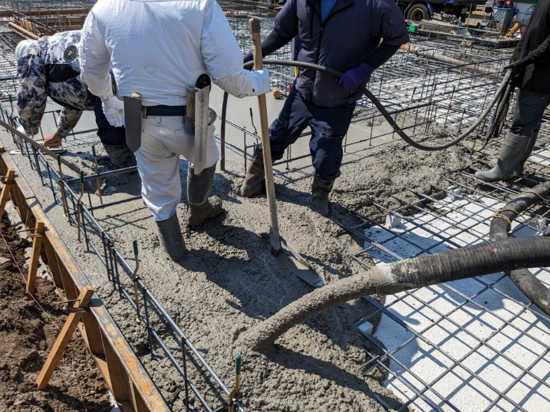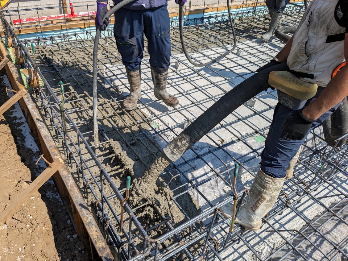 今日は、耐圧の打設作業です。圧送業者や土間屋さん等、みんなで猛暑の中での作業を乗り切りました。