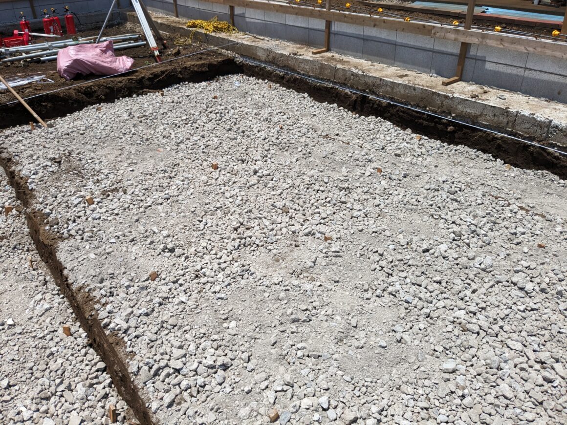 今日は、砕石敷き及び砕石転圧の作業をやりました。暑さに負けず全集中して地業工事が終わりました。