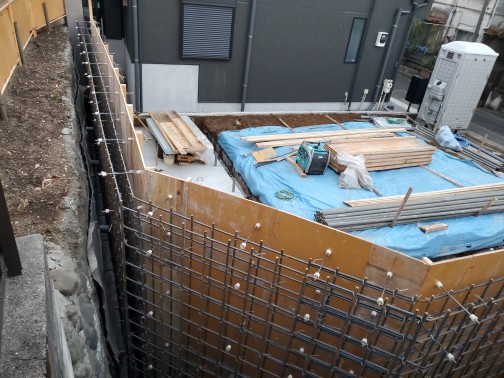 今日は、墨出し外をやりました段差が4段あるので墨出しに時間かかったが、外枠を建込み鉄筋も搬入して明日の配筋の段取りをして終わりました