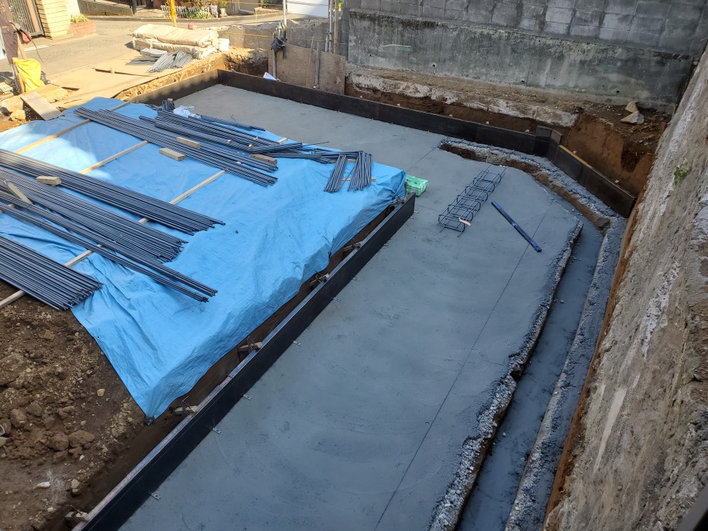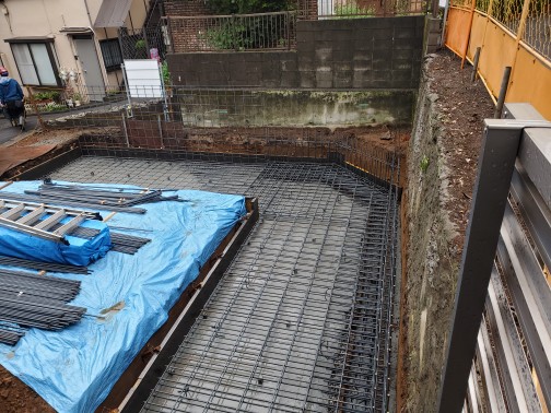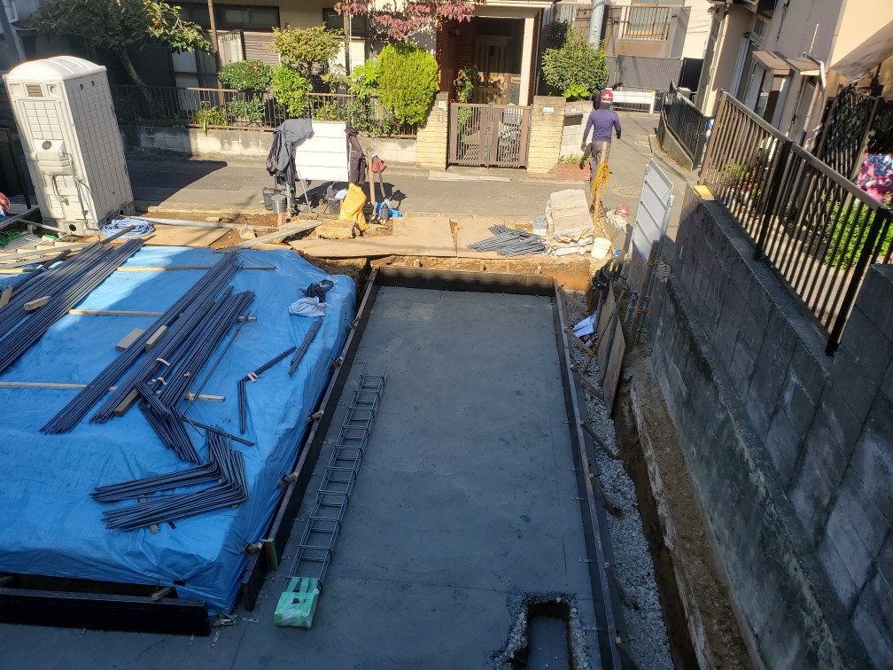 今日は、墨出しベース枠 配筋をしました道路が狭いので鉄筋搬入のトラックが入らないので現場の手前に