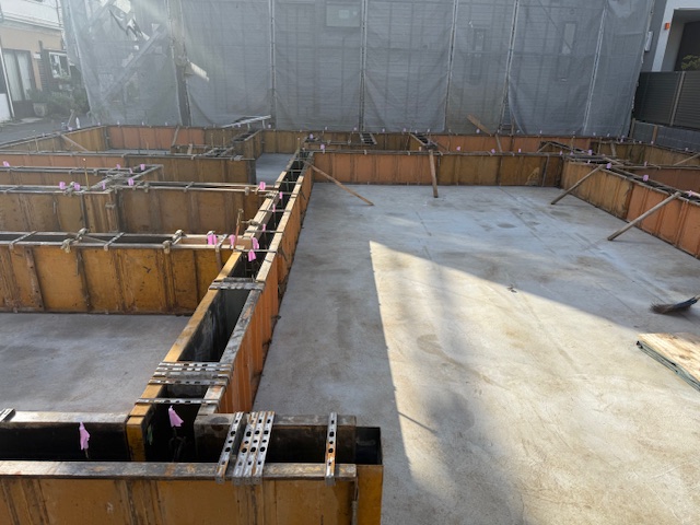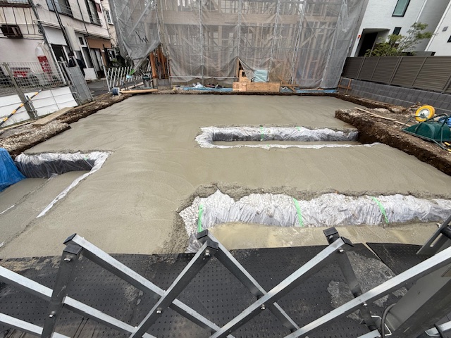 奥の棟の土間コンクリートを少し打ってから捨てコンクリートをやりました。