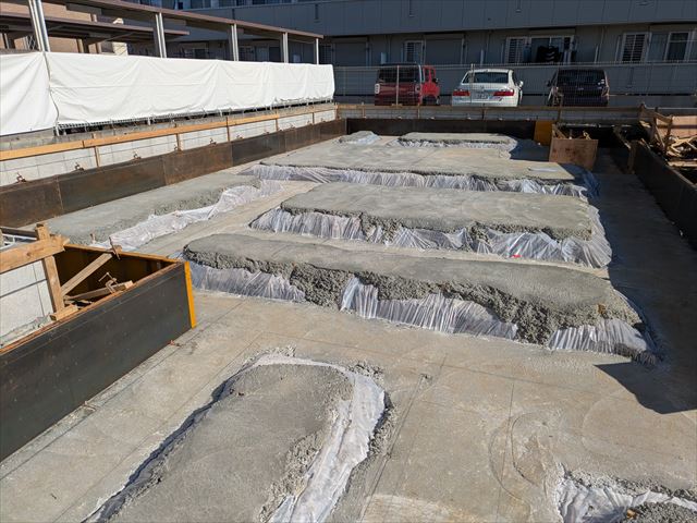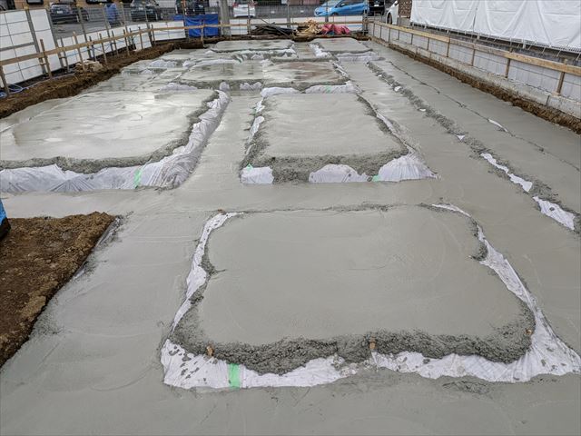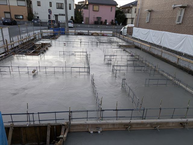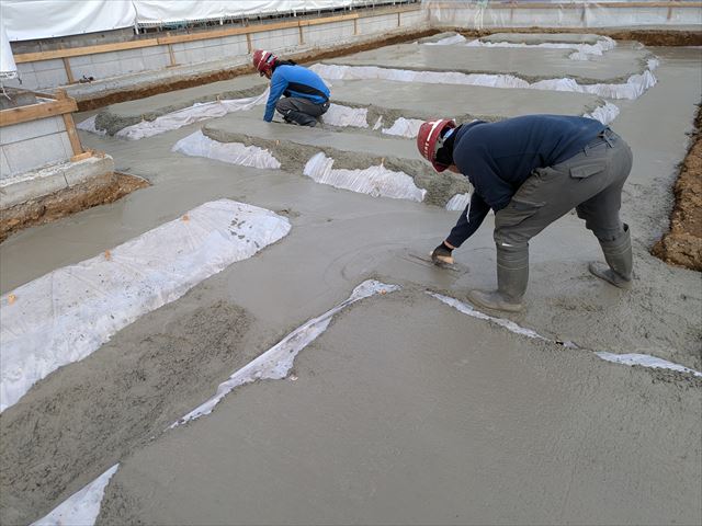 今日は、耐圧コンクリート打設です。順調にミキサー車がきたので、早めに打ち終わり、鏝おさえをしました。