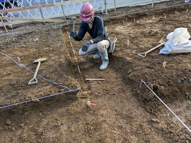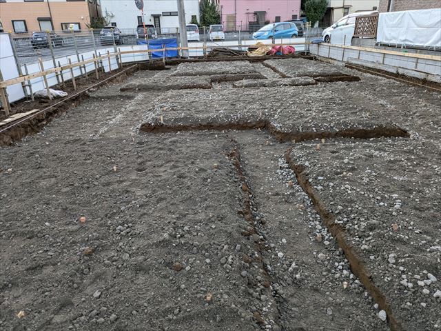 今日から基礎工事開始です。梁の位置に注意して根伐りしました。