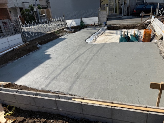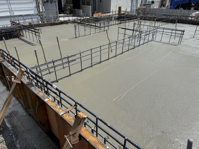 1棟は車庫のみ打設でしたが、生コン車が順調に来てくれたので、スムーズに終わりました。