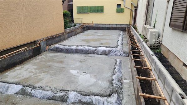 今日は9時からの耐圧コンクリート打設でした。周りにコンクリートがはねないように養生をして打設をしました。