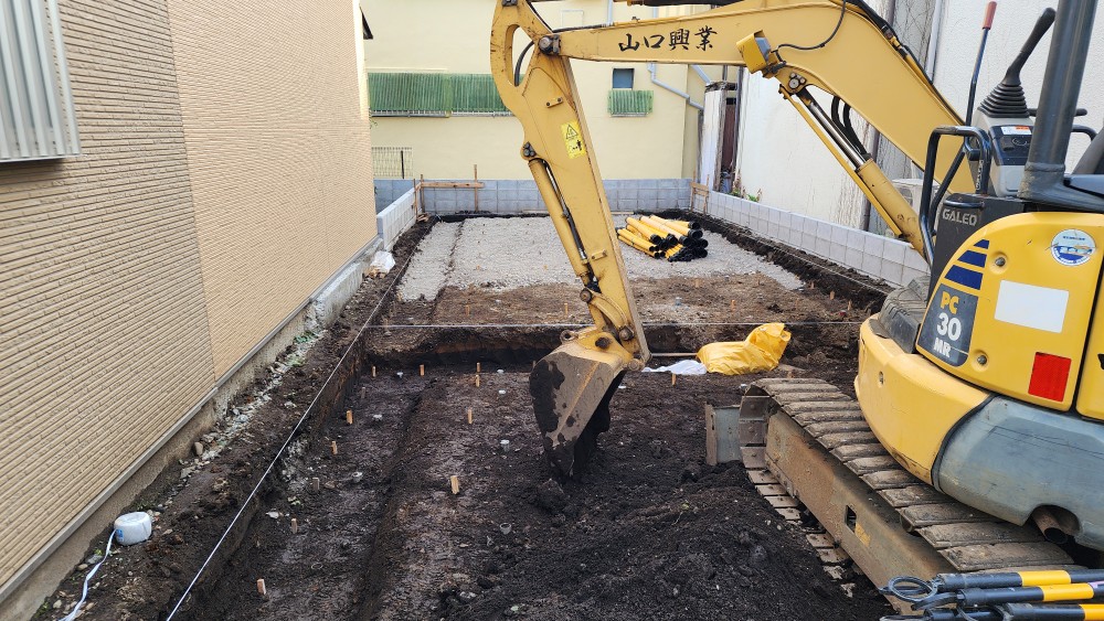 今日で根伐が終わりました。途中、雨が降っていましたがすぐに止んだので転圧も終わらせました。