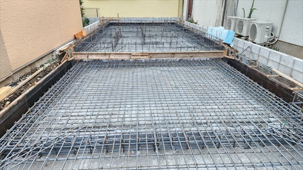 今日は10時頃、鉄筋が搬入され、夕方にはレベル、段差枠、アンカーセットまで終わりました。