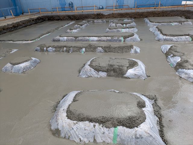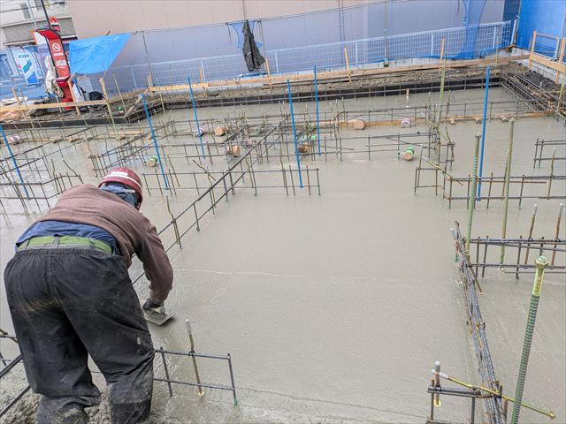 今日は、耐圧コンクリートの打設です。雨が心配でしたが、降られずにコンクリートが、打ち終わりました。