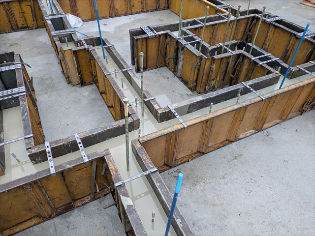 今日は、アンカーセット、段差枠の取り付け、深基礎部分の型枠をして、打設に向けて準備しました。