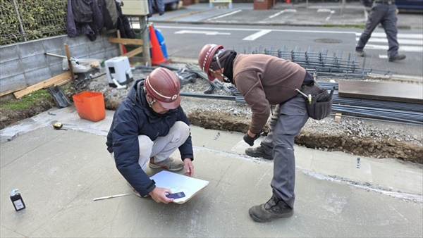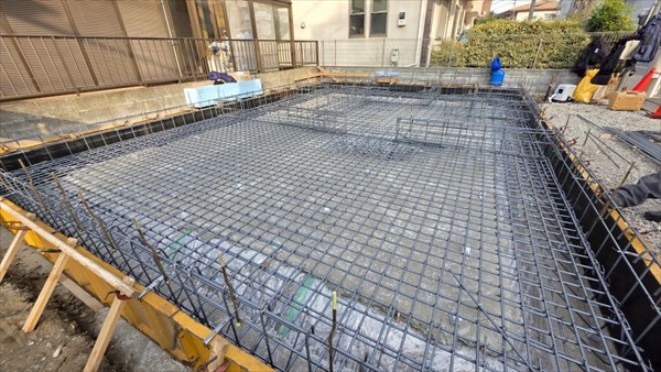 今日は朝から鉄筋の搬入と同時に、墨出し・外周枠組をしました。枠組が終わってすぐに配筋作業にとりかかり、夕方には配筋を終わらせ、レベルとアンカーを取り付けました。最後に結束線の切った屑とゴミを片付けて作業を終えました。