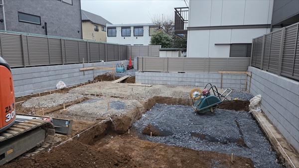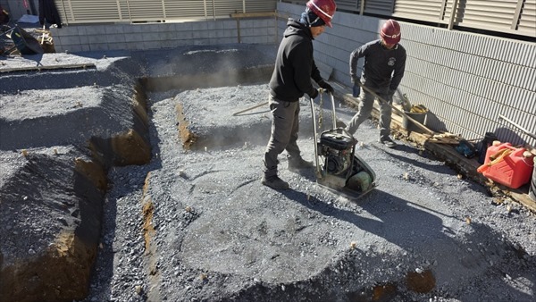 今日で地業工事が終わりました。何回もプレートによる転圧をしました。後日、捨てコンクリート打設を行います。