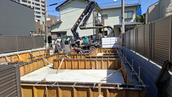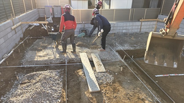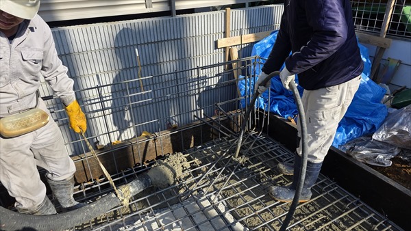 今日は朝から車庫部分の耐圧コンクリート打設を行いました。気温も暖かく早めに押さえることができました。