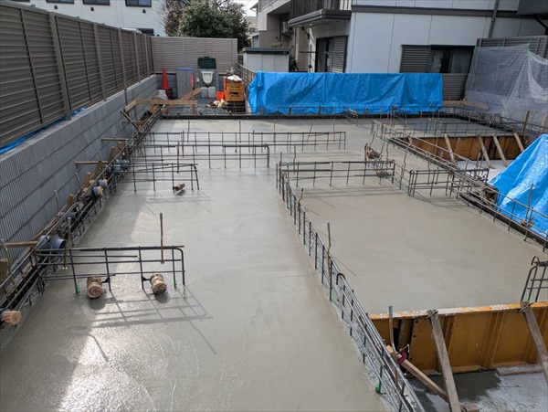 今日は朝から耐圧コンクリート打設をしました。暖かかったので午後には押さえることができました。