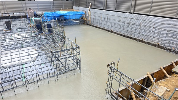 今日は朝から立ち上がりコンクリート打設をしました。昼頃には打設が終わり、午後からレベラーを流しました。